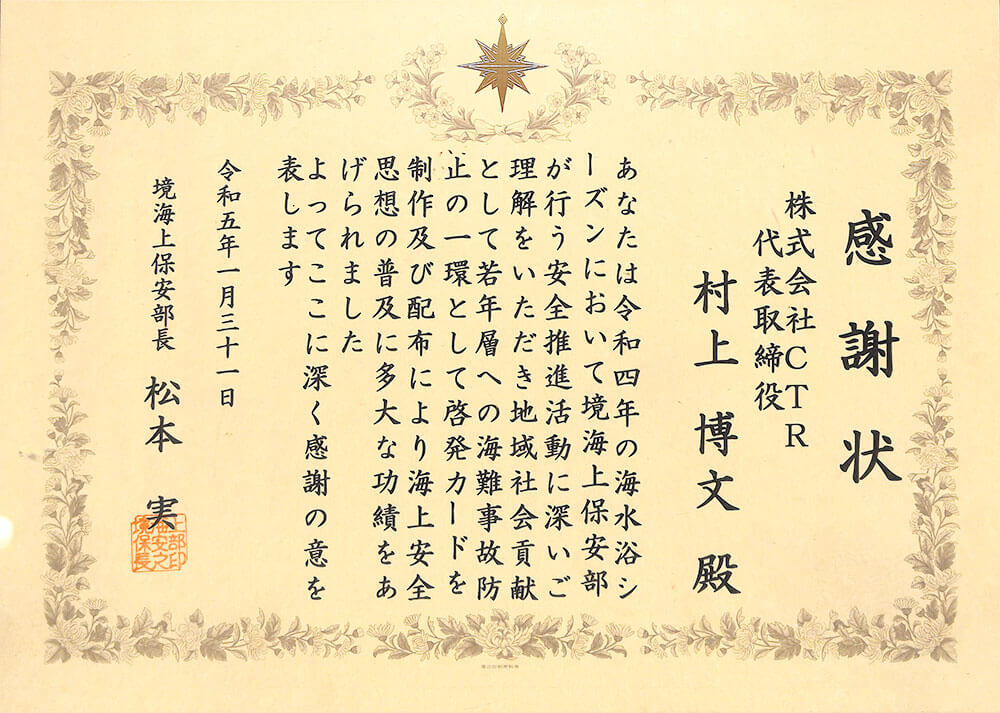 2月22日 境港湾合同庁舎で行われた贈呈式にて、境海上保安部より海難防止活動に対する感謝状を授与いただきました。