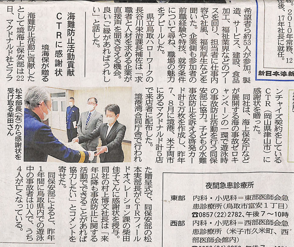 海難防止活動貢献の感謝状贈呈式が日本海新聞に掲載されました
